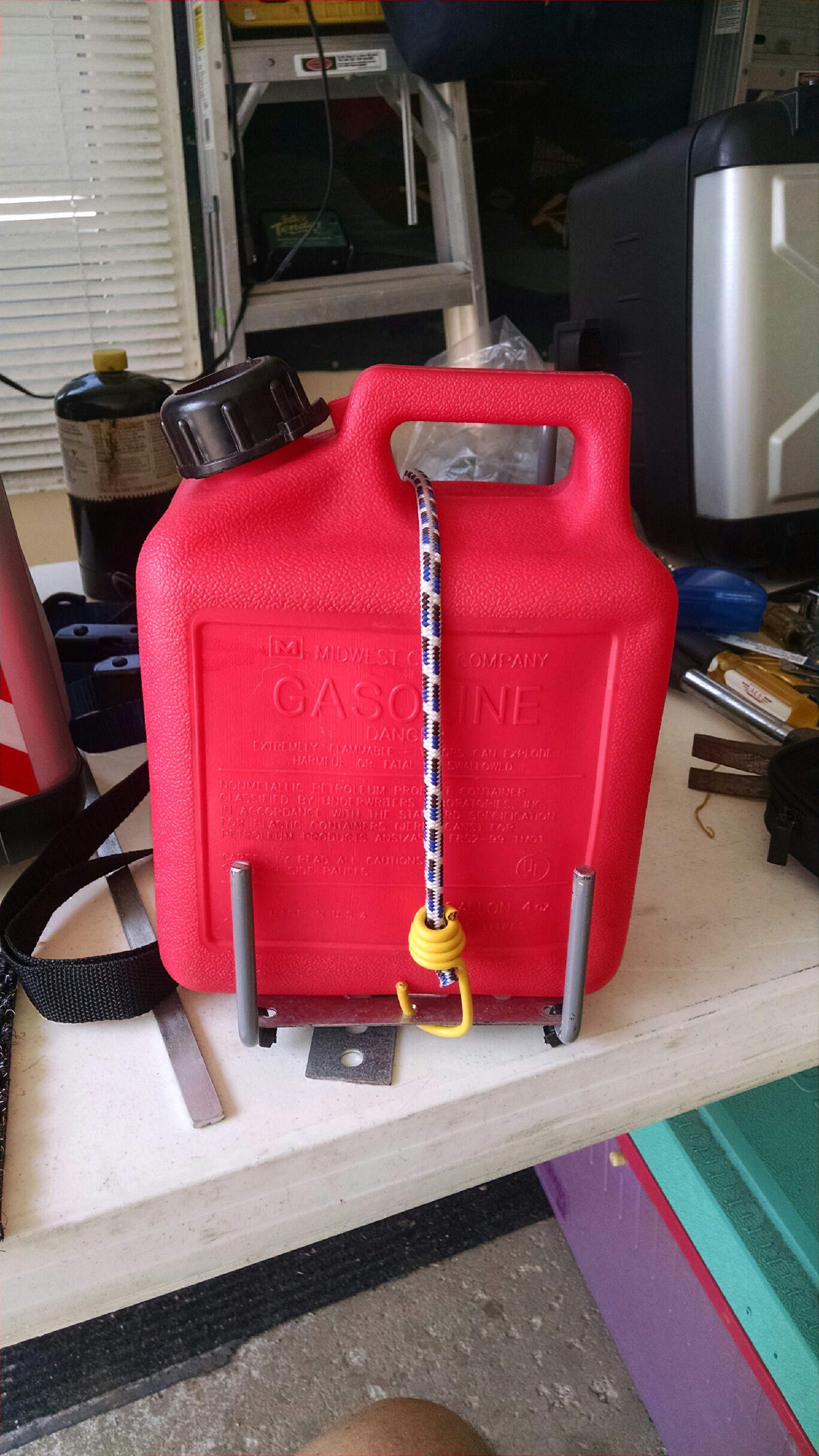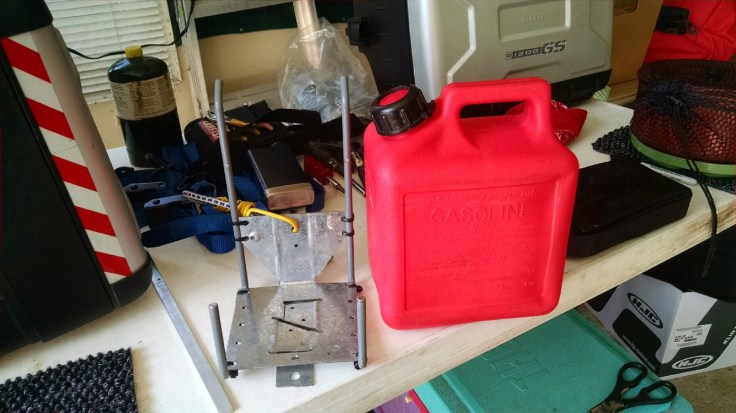 With the thought of running out of gas and being stranded in the middle of nowhere, which at times doesn’t sound so bad, I thought I would try and jerry-rigg up an option of bringing a gallon of gas along for the trip to AK. With a new 1 gallon gas can my brother-in-law Tony found in his garage, an unused weed wacker storage mount I found in my shed and an old joist hanger that was laying around, I went to work. The plan is to mount it on the outside of one of my panniers. It’s still work in progress and I still need to re-purpose some parts and I think it just might work. Once I get my bike back from the shop I should be able finish this sucker off and see how road worthy it is. Stay tuned!