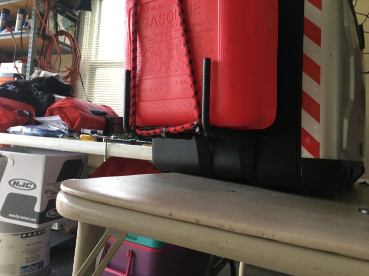 I finished up my little DIY project to be able to cary some extra petrol. I don’t think it turned out so bad. It was all made by scrounging up the parts from odds and ends laying around my garage. The next thing I need to do is get it mounted on my bike, which is in the shop getting some new rubber put on it, and take it for a test run to see how it holds up.