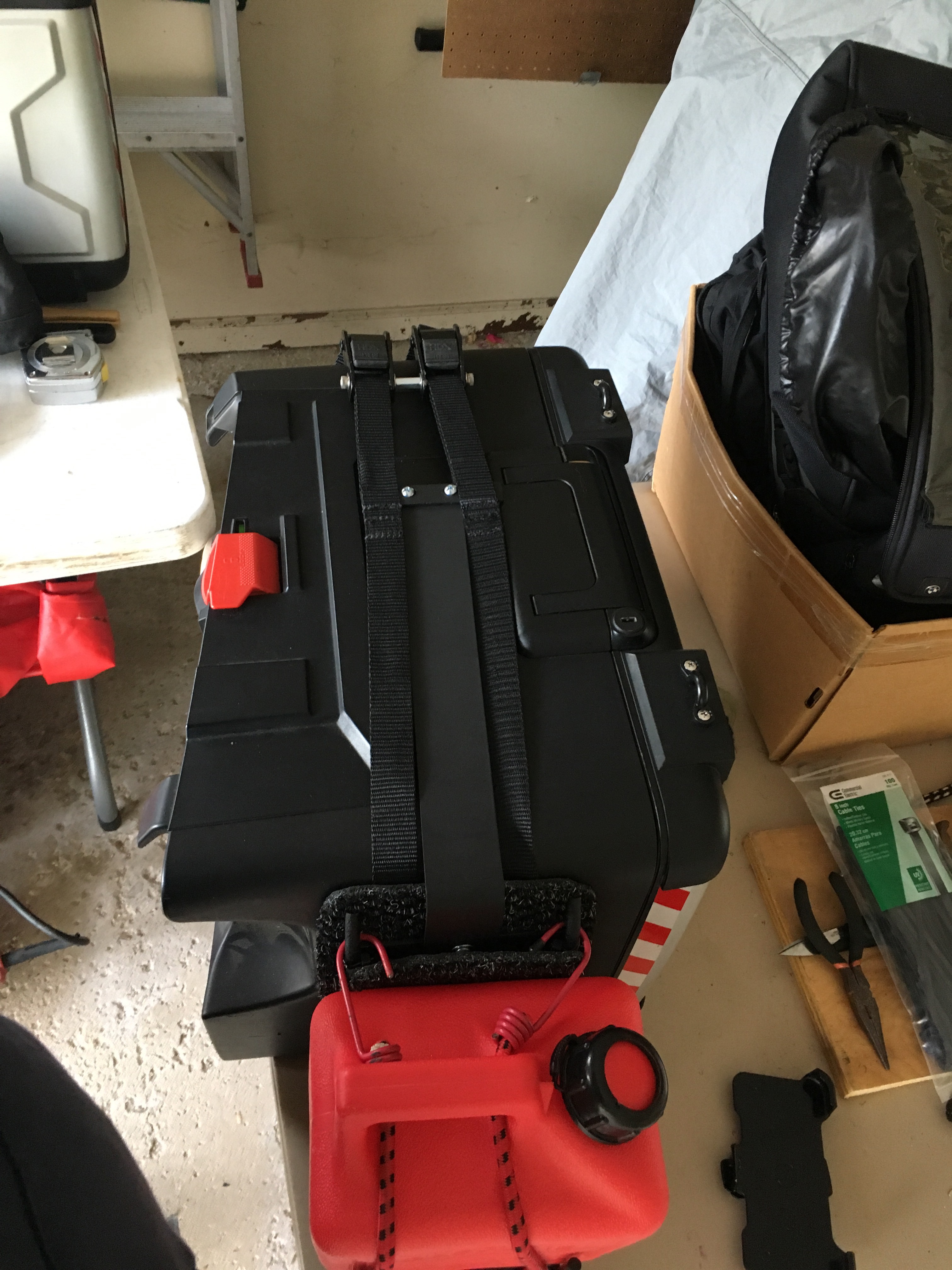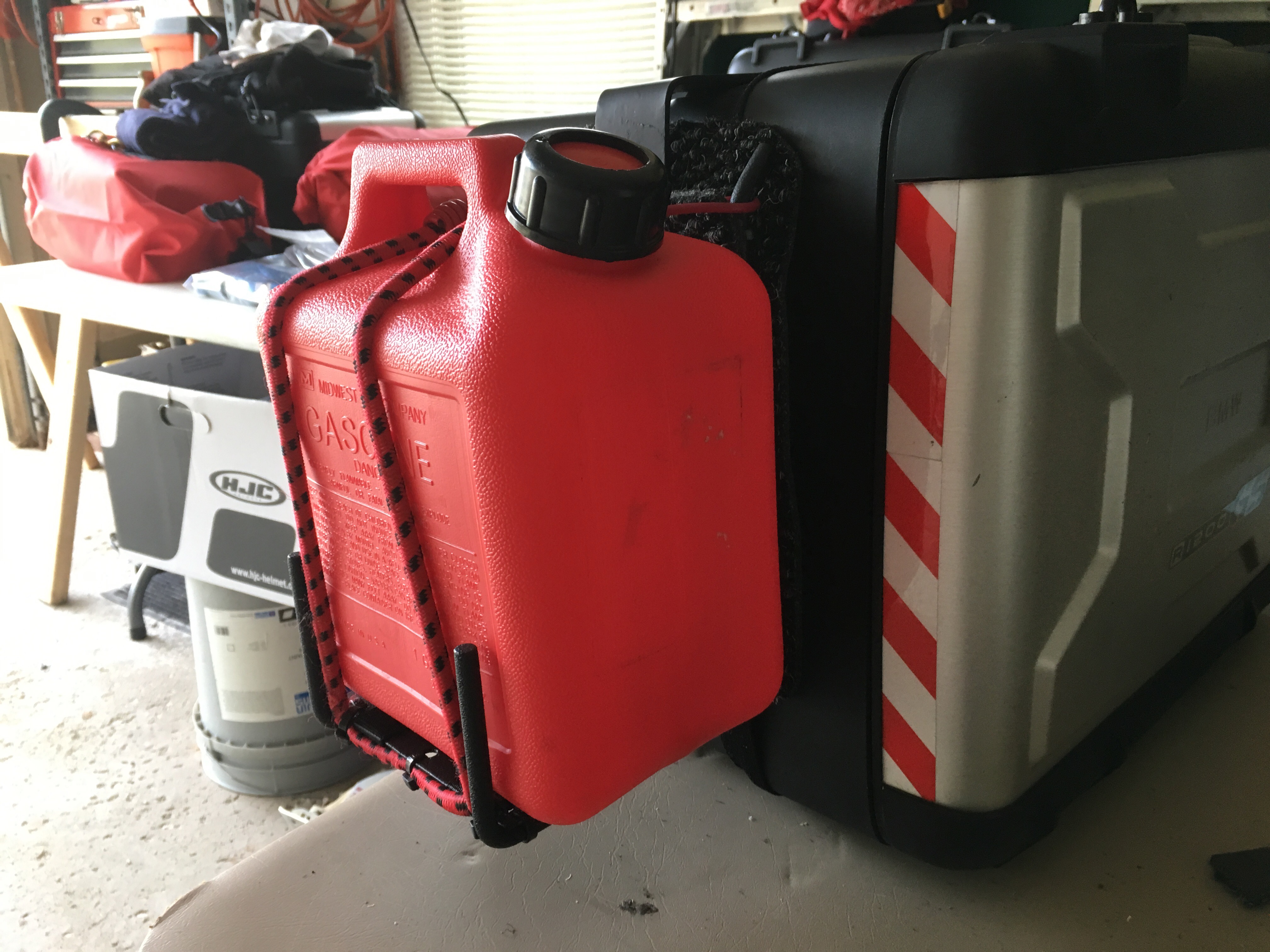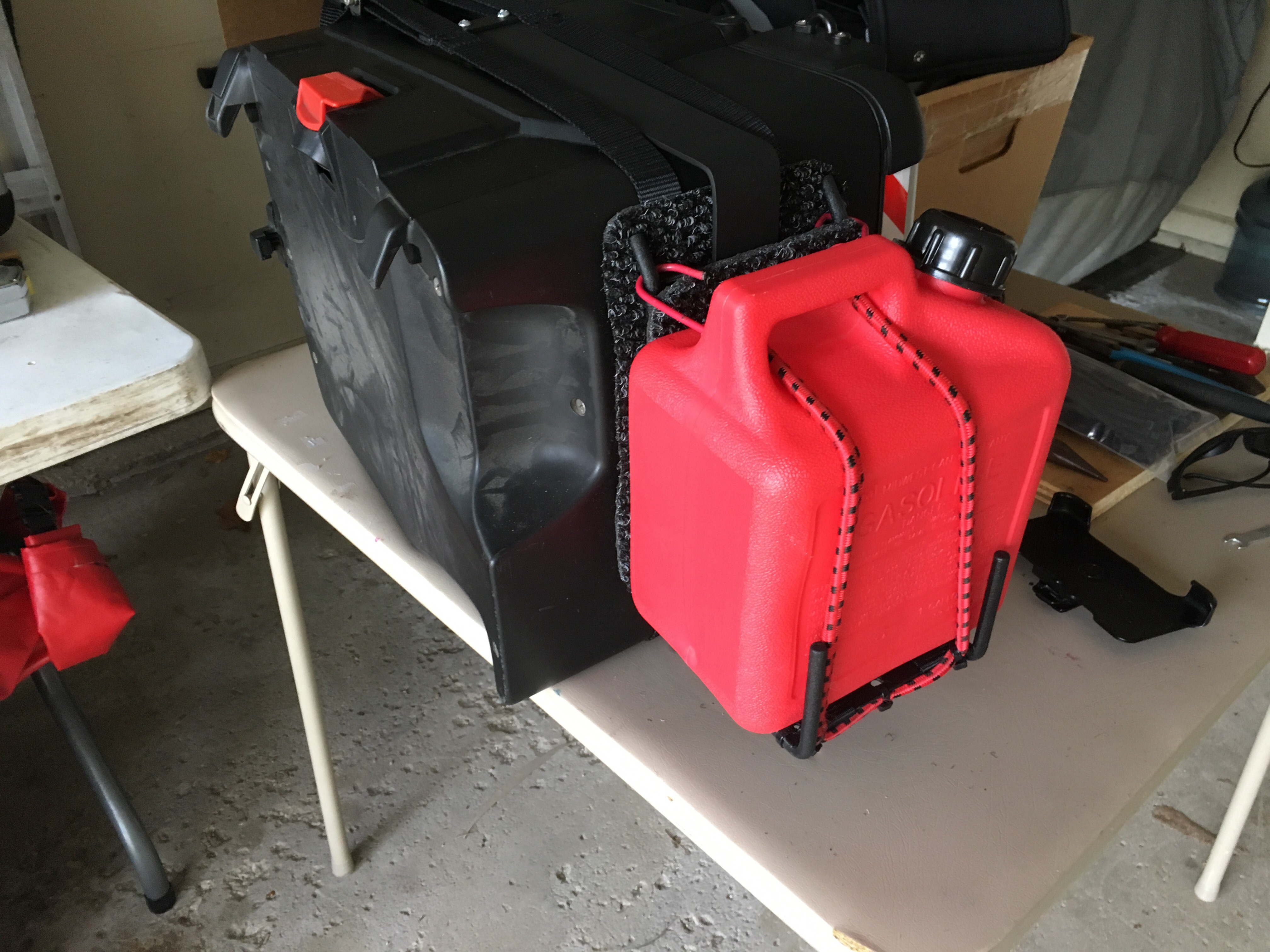 I finished up my little DIY project to be able to cary some extra petrol. I don’t think it turned out so bad. It was all made by scrounging up the parts from odds and ends laying around my garage. The next thing I need to do is get it mounted on my bike, which is in the shop getting some new rubber put on it, and take it for a test run to see how it holds up.
