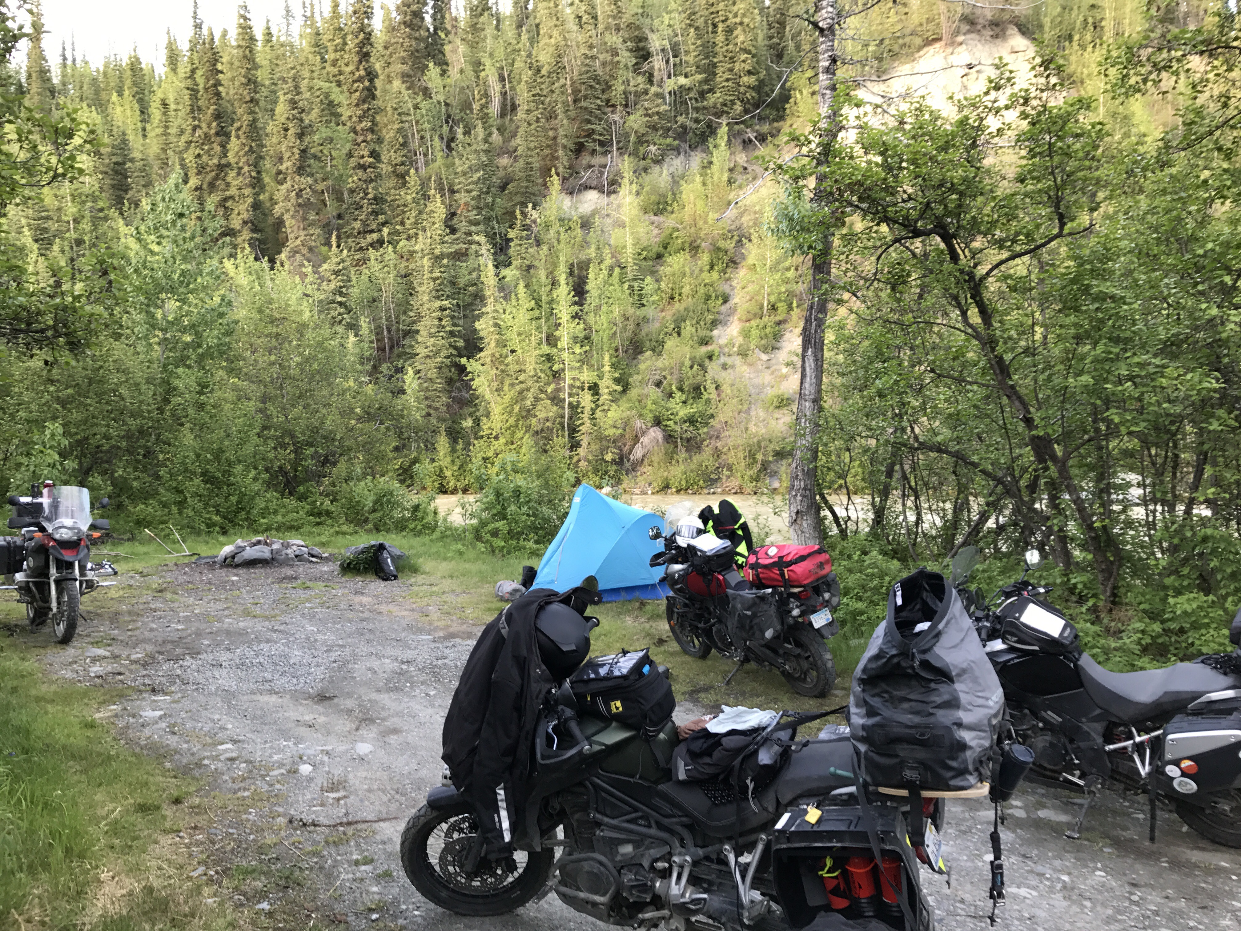We camped out last night at an abandoned campsite in Eureka, AK. This is in the Glenn Highway just past the Matanuska Glacier. Fire pits, flat tent sites, and a raging river. Oh yeah, and camping was free.